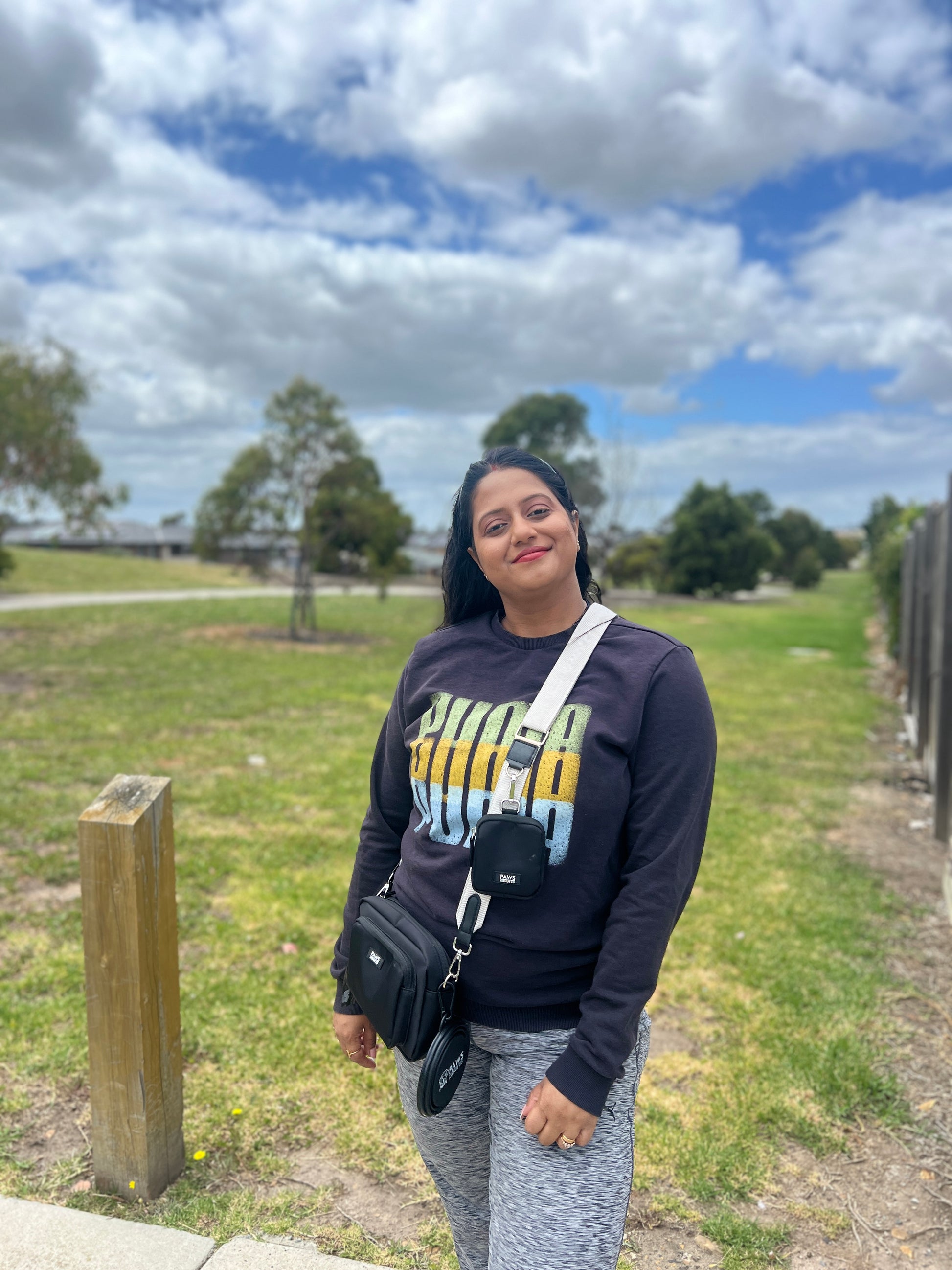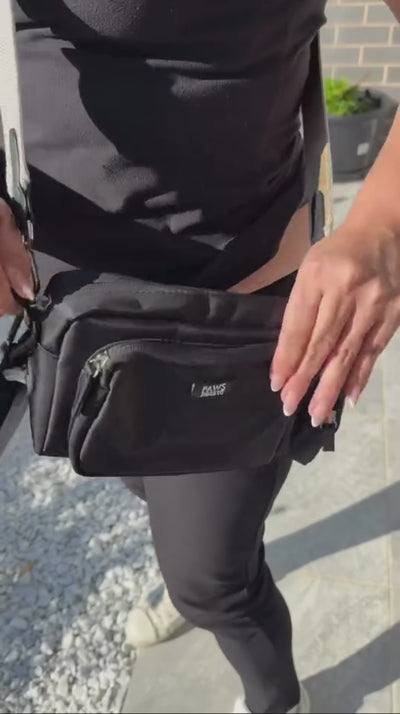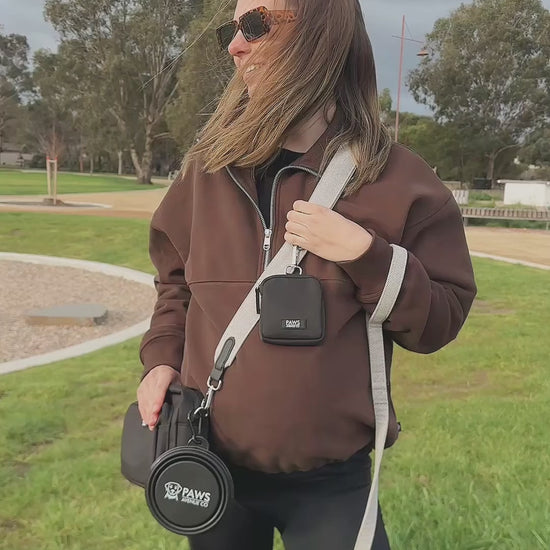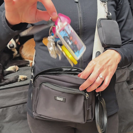 Our versatile bag is thoughtfully designed to carry all your essentials, including your phone, keys, poop bags, treats, collapsible water bowl and even small personal items like wallets and a water bottle.